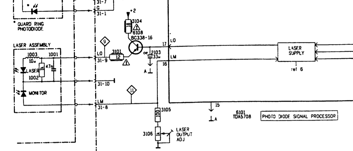 The capacitor acts as a reservoir to provide enough voltage for BC338 to power the laser LED. Notice the two current limiting resistors 3104 (18Ω – brown grey black) and 3101 (12Ω – brown red black) have warning triangles. This may indicate they are rated to blow if there’s a laser fault short circuit. So check both values using a multimeter are within 5%. Change if out of spec or if there’s any brown discolouration to the banding.