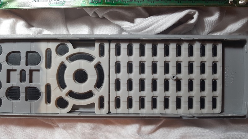 I’ve seen other posts suggesting use of fine sandpaper on the button contacts. I did not need this – a simple clean with water was sufficient. The button’s carbon film contact is very thin and I’m not sure it’s good to use an abrasive as it will rub away easily and increase resistance. I’d also avoid solvent contact cleaners which contain oil that can make the pads sticky and fail. You could try an alcohol cleaner on the buttons if water does not remove whatever’s built up inside. The circuit board has a green varnish insulating the fine PCB tracks which can dissolve in some solvents like acetone so test a small area first. You don’t want to leave a film of varnish over the button contacts!