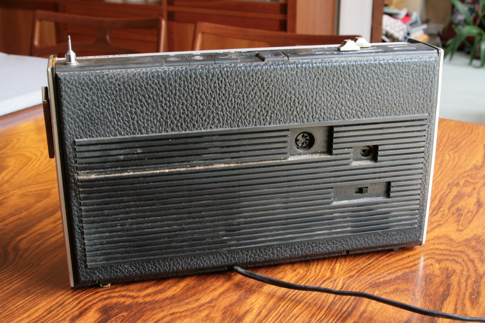 The radio has been cleaned, restored and serviced and is in fully working condition. The battery compartment is free from any corrosion and original aerial straight and clicks freely into position for full rotation. It’s fitted with a plug for mains operation or can run on a PP9 battery (not included but available from Wilkinsons or Maplins). Size is quite large so has the usual rich Grundig sound.