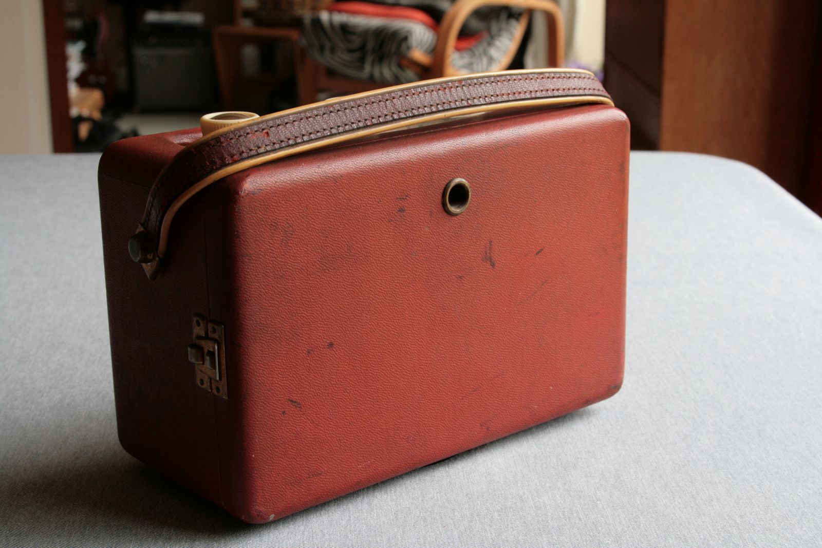 A respray was the only option for the case in signal red – a Wilco enamel paint that took a long time to dry and harden. Note to self – don’t use. Car celulose based sprays are best and allow more coats to build a nice result. This paint was too glossy and lost definition with too thick coat to cover. Silver spray covered the battery compartment after a scrape and sand down. You can just see the slightly rougher finish in the restoration.A bronze war hammer acrylic on the Roberts badge finished the vintage look. New badges are too bright and look wrong but are an identical fit and could be repainted if yours is broken. Many 60s sets have the R broken caight by over zelous dusting no doubt.
